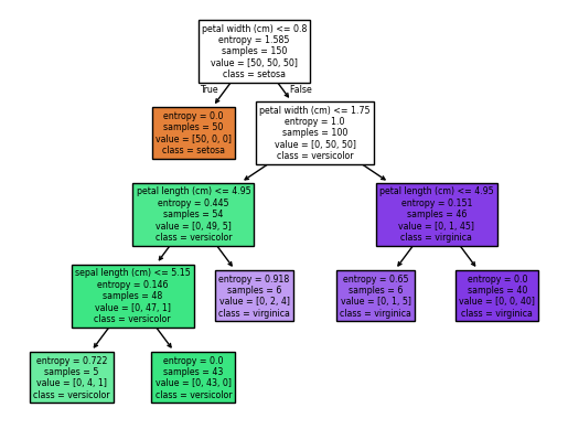 [Text(0.5, 0.9166666666666666, 'petal length (cm) <= 2.45\nentropy = 1.585\nsamples = 150\nvalue = [50, 50, 50]\nclass = setosa'),